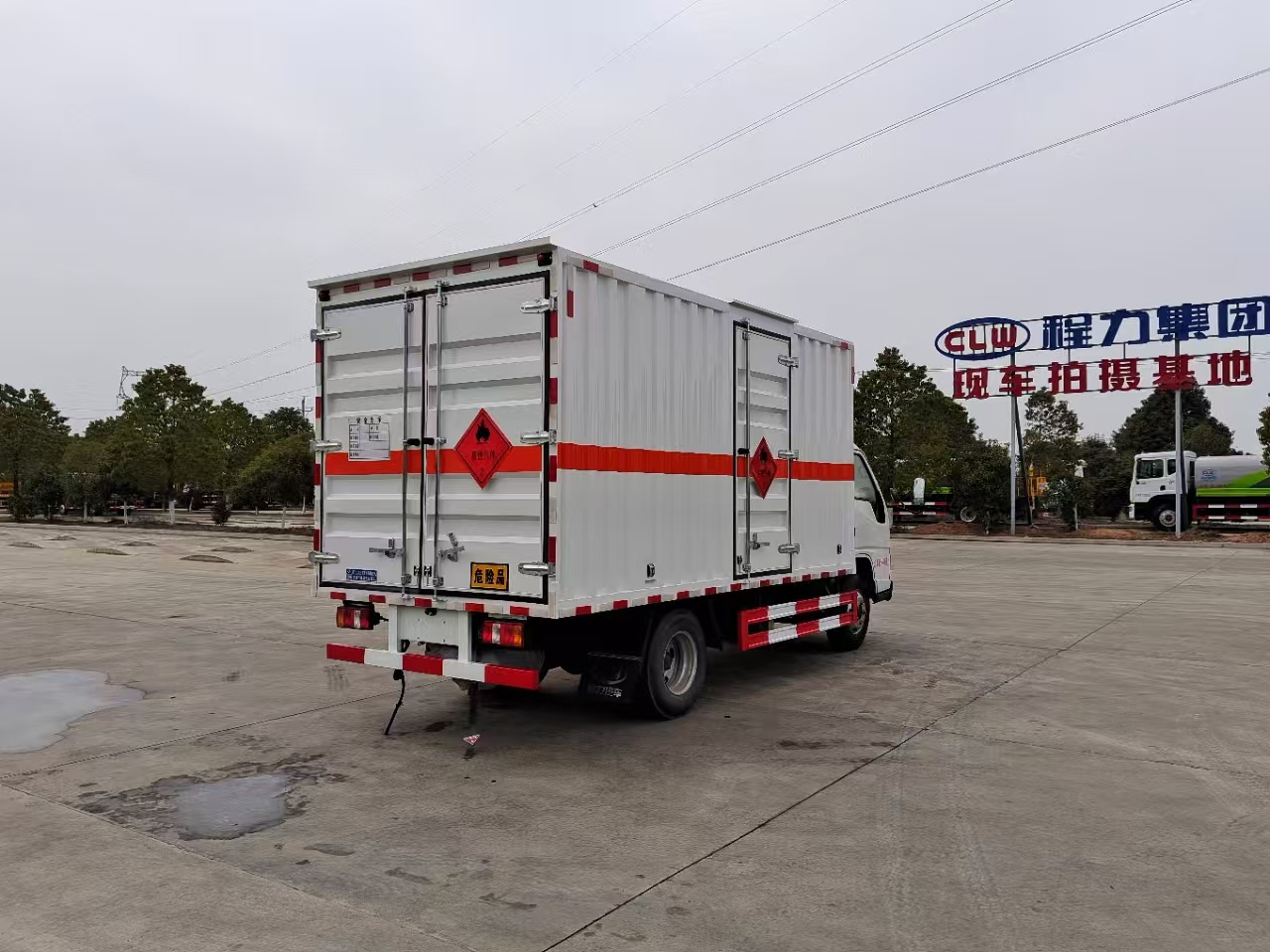 | 貨箱配置 | 廂體為雙層金屬骨架結構,外板采用冷軋鋼板,中間填充阻燃泡沫,內飾為鋁板。底板為平板上鋪防靜電膠皮。廂內兩側加裝固定貨物臥環,門框帶防盜報警器,頂部帶煙霧報警器,廂體右側選裝側門,隨車配2個滅火器,危險標志牌,防火帽,危險品三角頂燈。 | ||